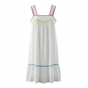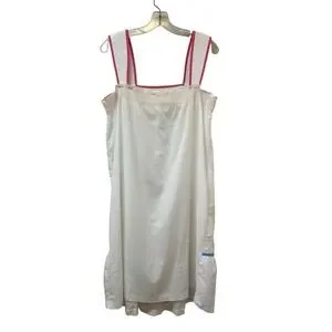 Vintage white cotton blend nightgown or house dress features a charming, smocked bodice with colorful ric-rac trim in pink, yellow, and blue. This Made in USA piece offers a relaxed, breezy silhouette with a ruffled hem and wide straps, perfect for lounging or as a casual summer dress. The lightweight fabric and side seam pockets add practical comfort to this nostalgic cottagecore aesthetic.