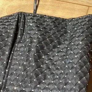 Solid black with single silver metallic thread that look like dots of sparkle, NOT rhinestones. The boning is flexible, not super stiff.