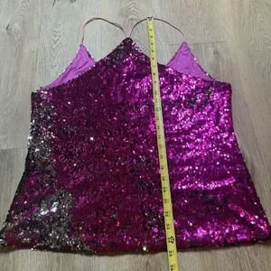 The Anna-Kaci Pink Sequin Top from the Sparkle & Shine Collection in size XXL is a stylish and eye-catching piece perfect for party or cocktail occasions. This sleeveless tank top features a racerback design with a solid pink color and sequin accents, adding a touch of glamour to your outfit. Made of polyester material and requiring hand wash care, this camisole offers a regular fit and is adorned with a Barbiecore and metal theme, making it a stand-out addition to your summer and spring wardrobe.