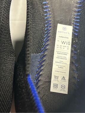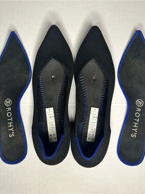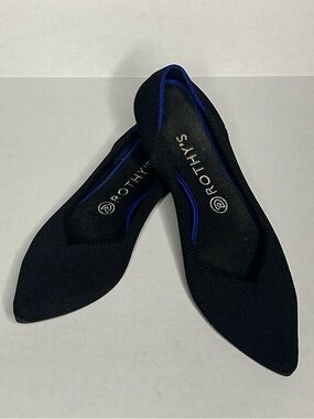 Sleek size 10 pointed-toe flats from Rothy's. Knit upper with classic contrasting blue trim. Slip-on design for easy wear. Flexible and breathable construction.