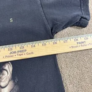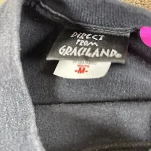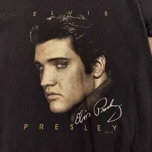 The Vintage Elvis Presley Big Face T-shirt in Youth Medium is a classic black shirt featuring the iconic image of Elvis Presley. Made by Graceland, this regular-sized T-shirt is perfect for men who appreciate vintage music and style. The shirt showcases a bold design with the famous Elvis Presley image, making it a must-have for fans of the legendary singer and Graceland.
