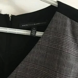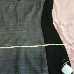 Crafted from quality materials, the dress features a sleek black back panel and a contrasting gray plaid front with a flattering V-neckline.