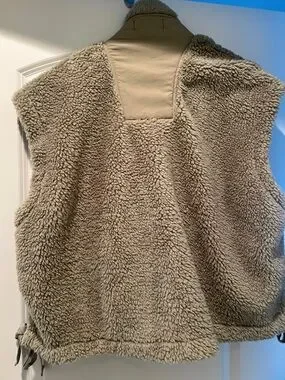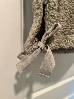 Plush sherpa exterior with snap-front closure. Side pockets for hand warmth. Adjustable side ties for fit. Sage green color. Size M, NWT