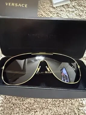 Bold Versace shield sunglasses. Black lenses with gold-tone frame accents. Sleek single-piece lens design. Signature Versace branding on bridge. Stylish and modern look.