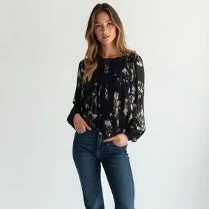 Style: Beautiful black floral long sleeve blouse with a feminine, flowy silhouette.