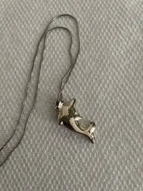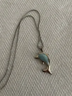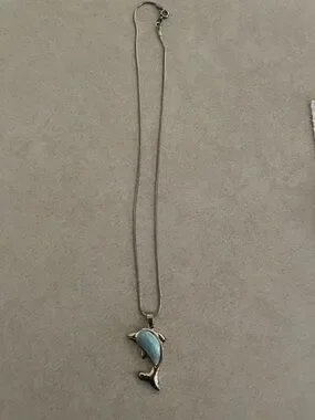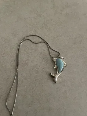 Silver-tone dolphin pendant with turquoise-colored stone inlay. Sleek silver chain with lobster clasp. Playful ocean-inspired design.