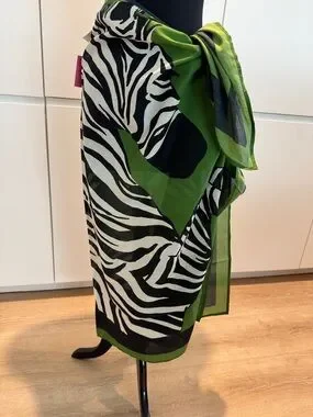 Graphic zebra print in contrasting tones. Lightweight fabric with bold pattern. Versatile accessory for casual or dressy looks.