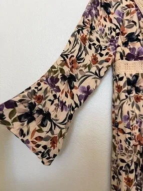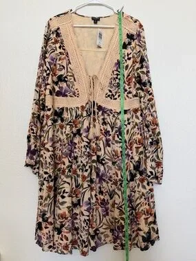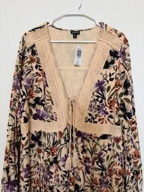torrid NWT Sand Floral Lace Up Crochet Trim Bell Sleeve Boho Dress Size 2X