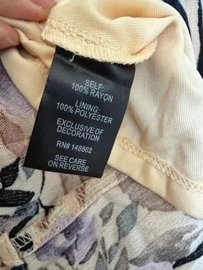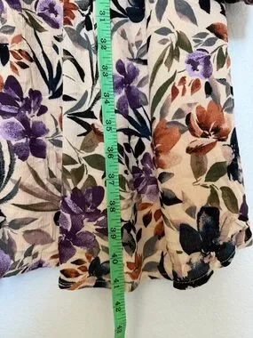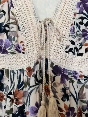 Soft floral fabric with lace trim, fully lined. V- neckline and delicate crochet detail, lace up front. Lightweight and airy, smoke free home.