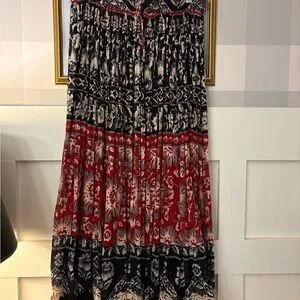 Elegant floral maxi skirt in striking red and black. Perfect for any occasion.