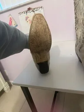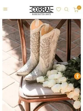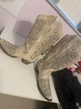 Corral white embellished leather knee-high boots with intricate silver-tone embroidery. Stylish western silhouette with a stacked heel for everyday wear. Soft leather lining and durable sole for comfort and long-lasting use. 8.5W