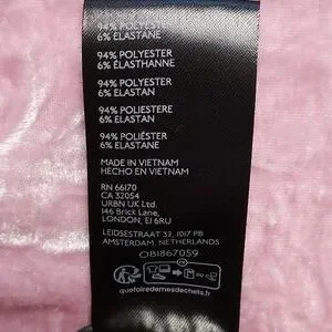 The care tag is missing, but the material makeup is 94% polyester and 6% elastane.