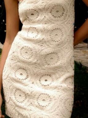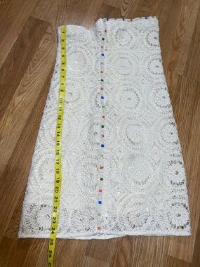 Strapless crochet mini dress in cream. Circular lace motifs across body. Slim, straight silhouette. Colorful beaded trim along sides for contrast.