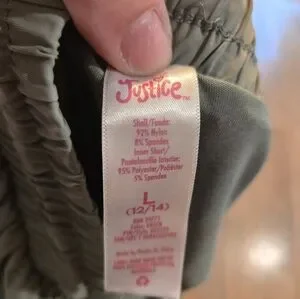 Light olive-green athletic shorts from Justice. Elastic waistband with drawstring for a secure fit. Lightweight, breathable fabric ideal for workouts. Relaxed cut allows easy movement. Small metallic logo detail at hem.