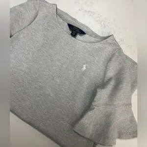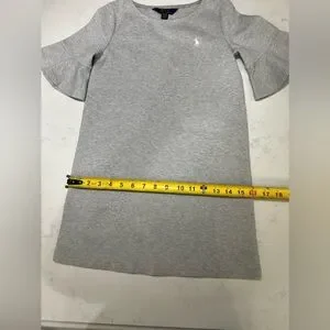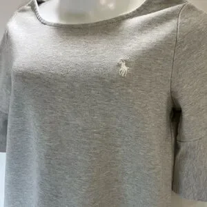 This elegant Ralph Lauren dress features a sophisticated bateau neckline and charming bell sleeves, perfect for casual or work settings. The sheath style offers a flattering silhouette, while the soft gray hue adds a touch of timeless elegance.