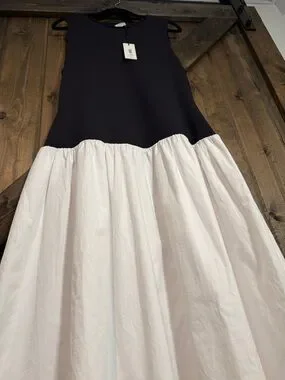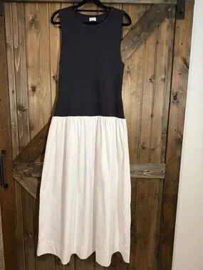 Sleeveless maxi dress with fitted black bodice and flowing white skirt. Clean, minimalist colorblock design. Light, airy skirt with subtle volume. Easy, elegant silhouette for day or evening.