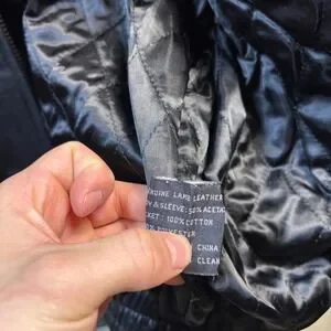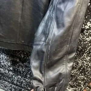 J. Park Collection bomber jacket crafted from supple genuine lamb leather in a classic black finish. This outerwear piece features a full zip front, a traditional pointed collar, and an elasticized waistband for a comfortable, tapered fit. The interior is lined with a quilted acetate and polyester blend for added warmth, while the exterior includes two welt hand pockets. A timeless silhouette that pairs well with casual or semi-formal attire. Note: There is some visible scuffing/discoloration on the sleeve as shown in photos.