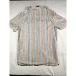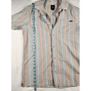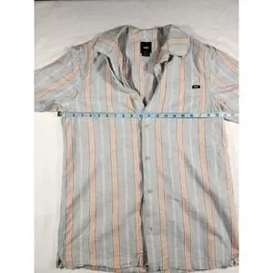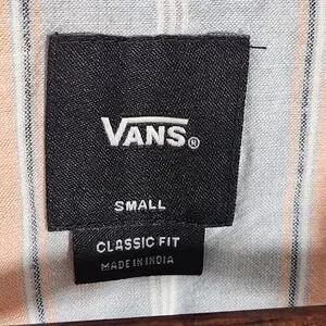 Vans Classic Fit Peach Blue Cabana Striped Short Sleeve Button Up Shirt Size Small. No flaws, no visible wear. See photographs for measurements. Ships fast from the USA! Bundle and Save! We combine shipping! SKU F00334