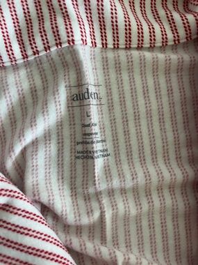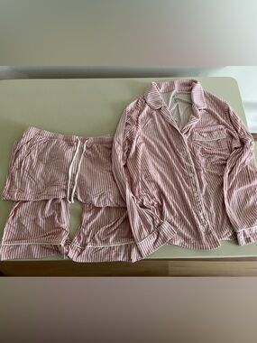 Soft red and white striped pajama set for comfortable sleep and lounging. Features a button-down long-sleeve top and matching drawstring pants with pockets. Breathable, lightweight fabric for all-night comfort. Classic striped design in red included for a timeless look.