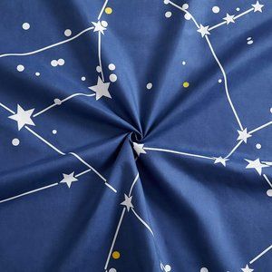 This Modern Galaxy Universe Patterns have Navy Blue Base with White and Yellow Stars Asterism Decorated on It. Printed Matching Design on the 2 Pillowcases. Our 120 GSM Double Brushed Polyester and Rayon from Bamboo is Soft and Durable and Features a Breathable Weave.