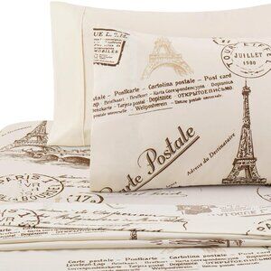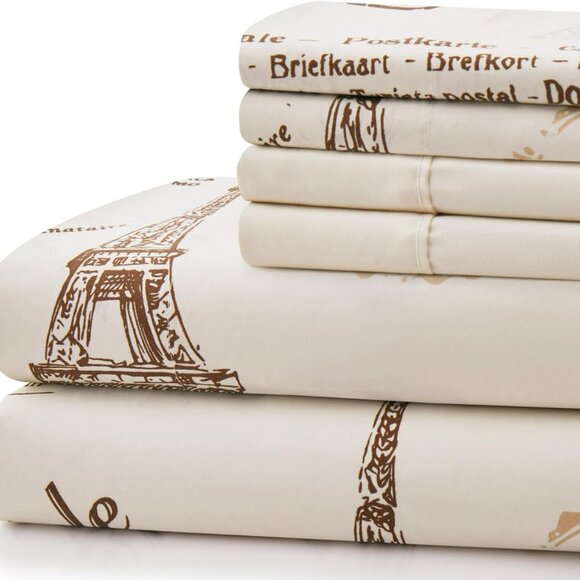 This modern pattern features a design of the Eiffel Tower in Paris, highlighted in brown and taupe on an ivory base. The matching printed pillowcases complement the overall look. Made from double brushed polyester and rayon from bamboo, this fabric is soft, durable, and has a breathable weave.