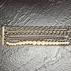 6-Strand Statement Bracelet – Brass Chains, Faux Pearls&Crystals 7" Y2K Revival
