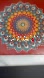Hand painted by me, find peace in the design Vibrant mandala art featuring intricate patterns on a canvas. Dominant colors include red, blue, and yellow.