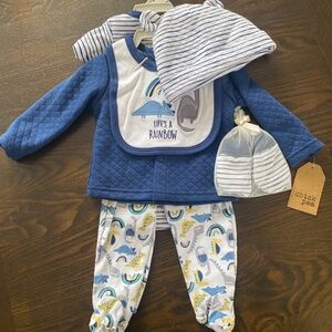New never worn Hat, baby mitts, bib, onesie, long sleeve sweater, sleeper Tags on, price tag missing