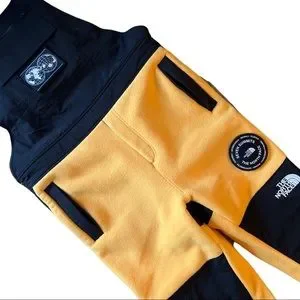 “The 7 summit himalayan fleece suit in yellow and black by the north face. Paying homage to the 'seven summits', this high performance fleece suit is equipped with two adjustable shoulder straps, three zipped pockets, insulating fleece, pouch pocket and embroidered logo.”