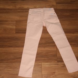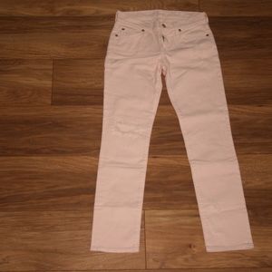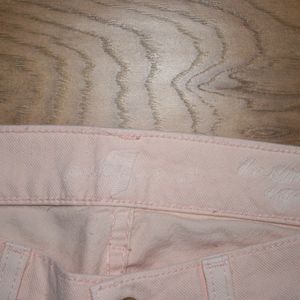 Beautiful, light-worn, soft stretchy denim in pale, pastel pink.