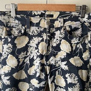7 For All Mankind The Cropped Skinny in Black Floral. Cropped ankle length and High rise 9” rise . The material feels similar to denim. The print is black with white, yellow, and cream floral. There is some minor wear on seams on the thigh area pictured.
