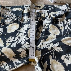 7 For All Mankind The Cropped Skinny in Black Floral. Cropped ankle length and High rise 9” rise . The material feels similar to denim. The print is black with white, yellow, and cream floral. There is some minor wear on seams on the thigh area pictured.