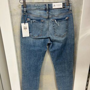 New with tags, never worn. 7 For All Mankind - Skinny fit ankle-length denim crafted with our best-selling super stretch denim in a classic light blue wash. Hand sanded to perfection, this pair features destroyed hem and cut-off back pockets.