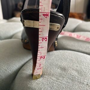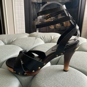 7 for all mankind black leather heels with gold/ brass tone hardware/ studs detail, gold toned logo on back of heels, two ankle straps, wooden/ rubber outsole/heels with ombré effect. Size 37. Excellent pre owned condition with a few small light scratches on leather and wear to outsole mainly on the heel tips. Please see photos, measurements are for reference only. Reasonable offers welcome! New to Poshmark?! Sign up using code THRIFDEESTHINGS to receive $15 on your first Poshmark purchase!