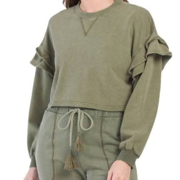 Army green acid washed 7 For All Mankind cropped sweater with a ruffled sleeve detail in like new condition!