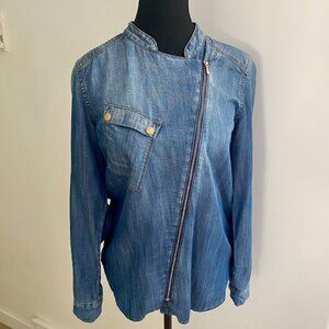 7 For All Mankind denim blouse in size XS. This blouse features a modern and edgy take on a classic denim blouse. It has an asymmetrical zip and front pocket, is lightweight, oversized, and made from 100% lyocell.