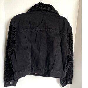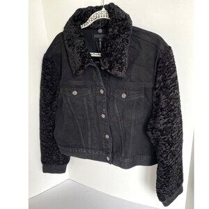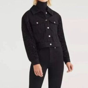 7 For All Mankind Denim Jacket Womens Black Crop Faux Shearling Fur Collar Arms