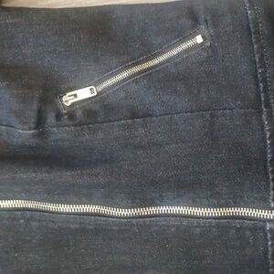 Stylish 7 For all Mankind denim on faux leather moto jacket featuring silver zippers. Perfect for a chic look