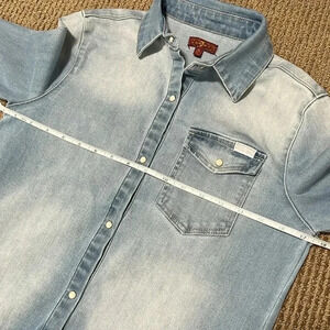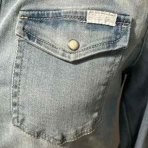 Like new condition. Long sleeve with rolled cuff option, snaps to hold cuffs up. Fold down collar. Snap front. Functional front pocket with snap closure. White pearl snaps. Raw frayed slightly rounded hem. Faded light wash. Cotton/ spandex blend - loads of stretch.