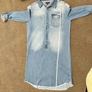 7 For All Mankind Stretch Denim Raw Hem Long Sleeve Shirt Dress Faded W…