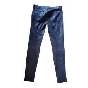 7 For All Mankind Women's Coated Skinny Jeans feature a sleek, modern skinny fit that runs from the hip to the ankle. They appear to have a mid-to-high rise fit. The jeans maintain a classic five-pocket design with a zip fly and button closure. They have an ankle-length cut.