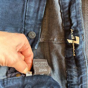 Designer Jeans, Size 31, long, model is 5'10" wearing heels. Between boot cut and flare.