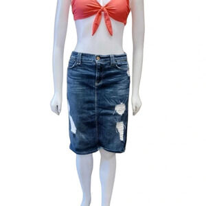 Medium wash denim with factory distressing, this pencil skirt features a five pocket design with belt loops and a slit in the back. A button and zip closure with some stretch available.