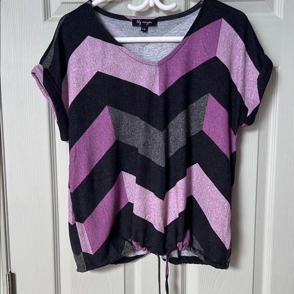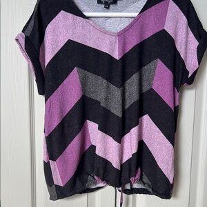 Elevate your wardrobe with this chic chevron patterned top. Featuring a blend of black, purple, and gray, this top is perfect for any occasion. Enjoy the comfort and style of this versatile piece. Ptp 18