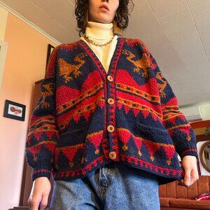 This beautiful all-around print cardigan screams cabincore aesthetic and is extremely cozy. It is 100% pure wool, and is NOT shrunken, which is super rare to find in vintage wool clothing! It features a high-quality, chunky knit, and big wooden buttons.