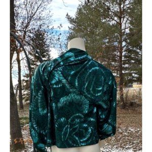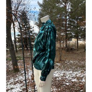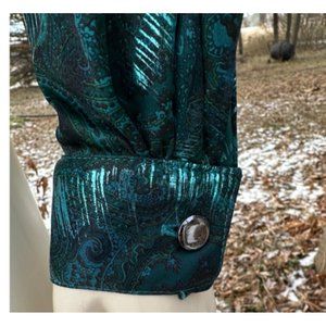 70s Bernard Cowan Liquid Satin Blouse Jacquard Print Green Metallic Mock Neck Sz