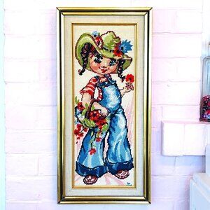 Embroidery Project 70s Wall Hanging Vintage Cross Stitch Thread Art Gallery Wall Country Cottage Girl 70s Fashion 80s Kid Bedroom Needlepoint Art Big Eye Art Handmade Wall Decor Flower Girl Retro Home Decor