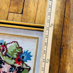70s Big Eye Prairie Girl Needlepoint Framed Fiber Art, Embroidery Canvas Wall Hanging, Vintage Cross Stitch Project, Arts Crafts Thread Work