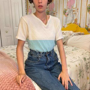 70s Blue and white colourblocked knitted acrylic vneck sweater shirt