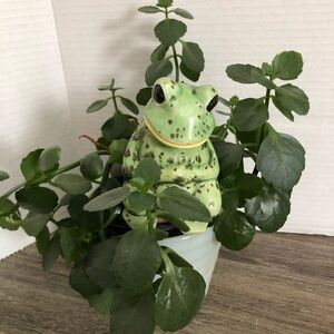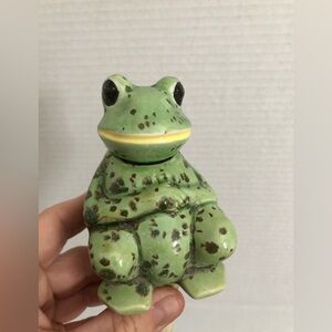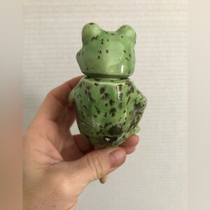 Adorable hand painted frog with a sort of splatter pattern. Head removes to allow you to fill the body with water. Dated 1977 on the bottom, painted by Marie.